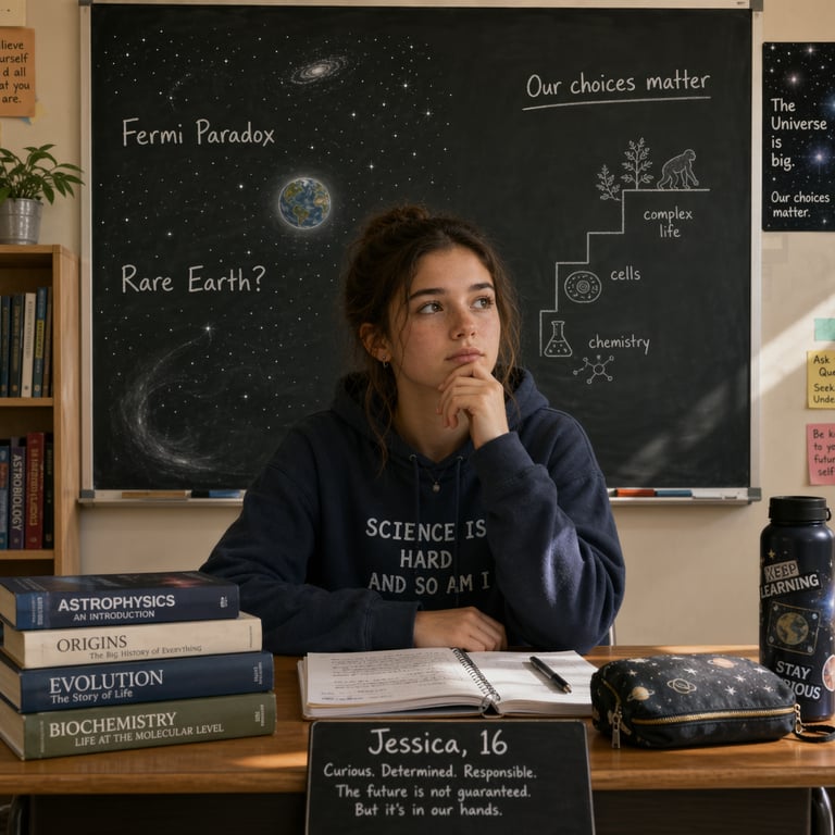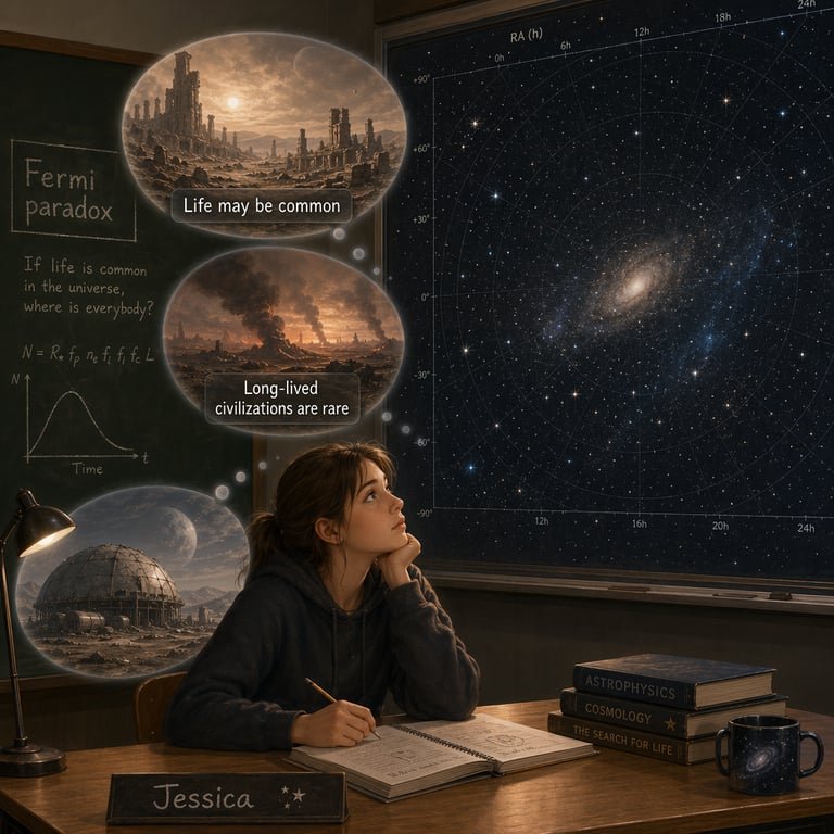 When the class discussed alien life, Jessica realized two thoughts were colliding. First: with so many worlds, intelligent life seems likely. Second: despite decades of listening and looking, there’s no clear evidence of visitors, signals, or megastructures. The tension between “should be common” and “we see nothing” became the puzzle she couldn’t stop turning over.