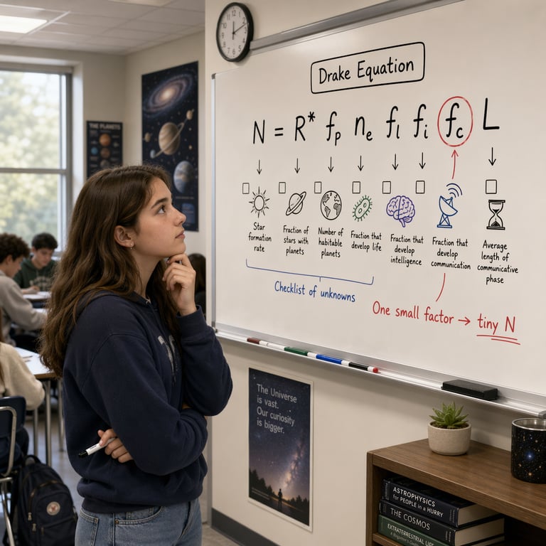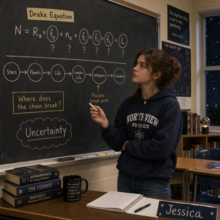 Jessica started asking where the chain might break. Maybe planets with stable climates are rare, or maybe life begins often but almost never becomes complex. Perhaps intelligence evolves, but tool-making civilizations are brief, distracted, or self-limiting. The equation didn’t answer her; it showed her where ignorance lives, and why confidence about aliens can be premature.