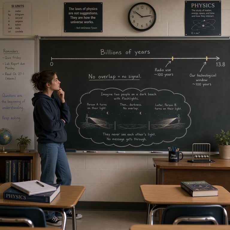 Numbers on the board showed Jessica how time can hide neighbors. Humans have used radio for about a century—an eye-blink next to billions of years. Even if civilizations are common, two have to overlap in time to notice each other. Jessica pictured two flashlights on a dark beach: if they flick on at different moments, the beach stays dark anyway.