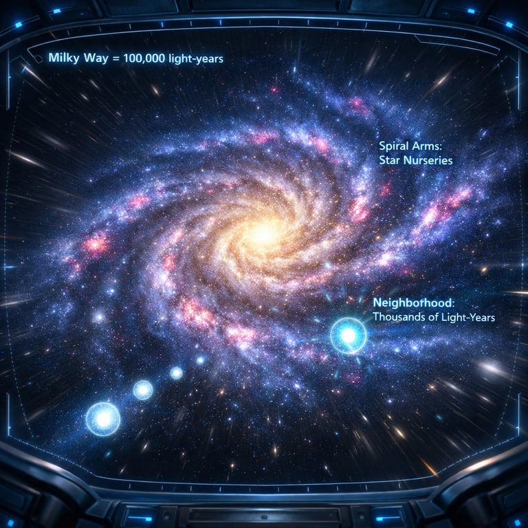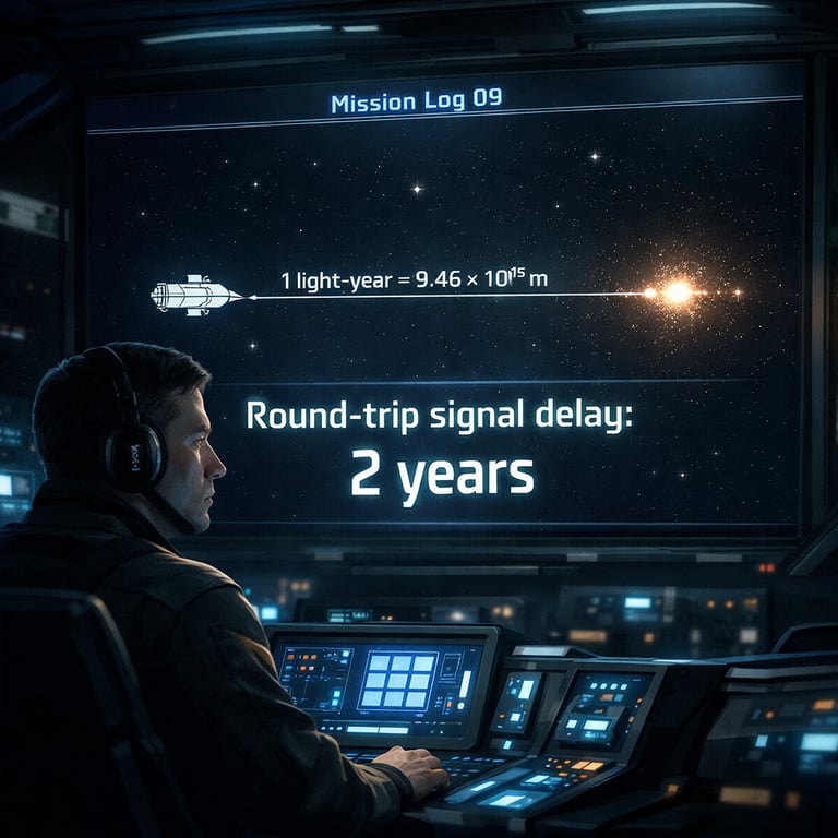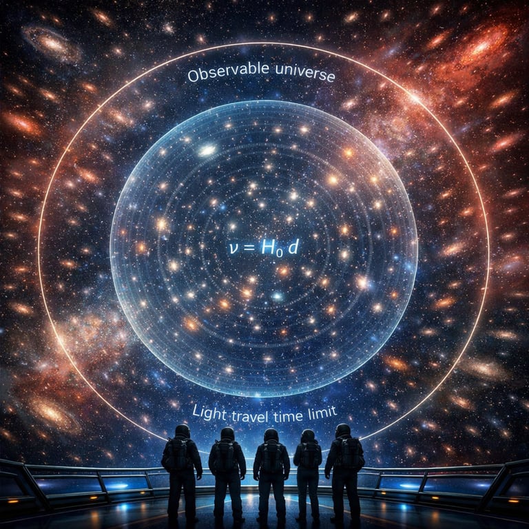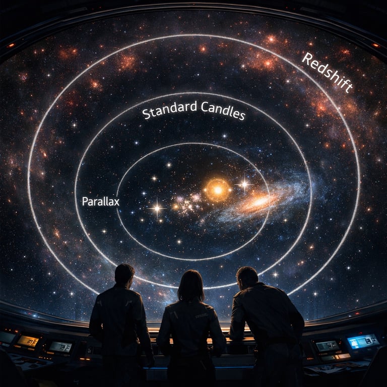 Mission Log 12: To measure beyond travel, the crew upgrades their “ranging kit.” Nearby stars yield to parallax; farther ones require standard candles like Cepheids and Type Ia supernovae; the deepest distances lean on redshift trends. Each method extends the last like nested instruments, letting the team build a trustworthy scale map without ever crossing the void.
