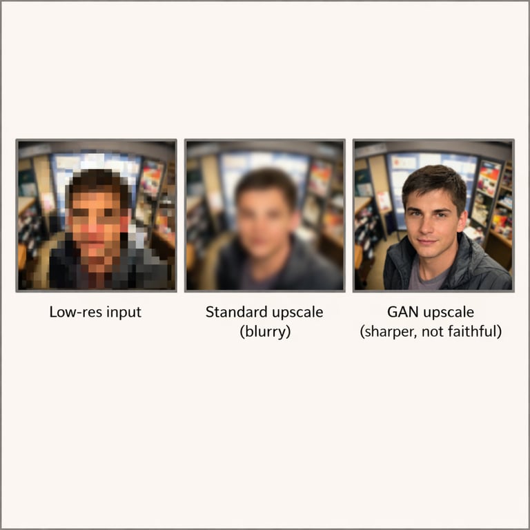 GANs can upscale images by generating realistic-looking fine detail instead of just smoothing pixels. Show a three-panel figure: low-res input, standard upscaling (blurry), and GAN upscaling (sharper). Also note the key tradeoff: the extra detail may be believable but not guaranteed to be faithful, which matters in forensics, journalism, and science imagery.