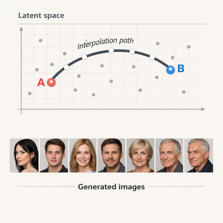 The generator’s input noise lives in a “latent space,” where nearby codes often produce similar outputs. A great demo is interpolation: pick two random codes and smoothly slide between them, showing faces or objects morphing gradually. This suggests the model learned meaningful factors—like pose or color—rather than memorizing fixed pictures from the dataset.