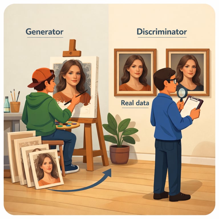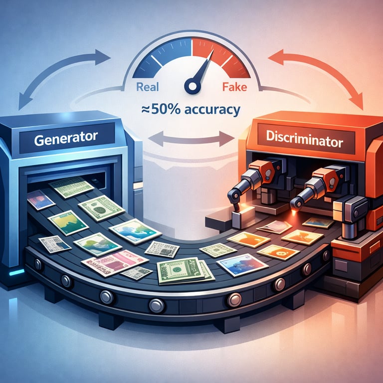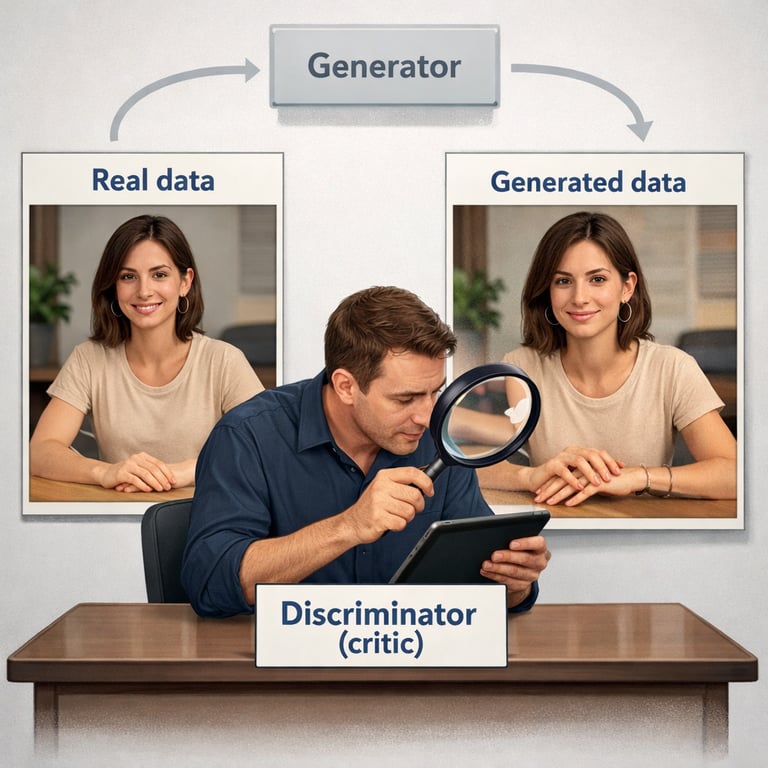 The discriminator is the critic: it sees an input and predicts whether it came from the real dataset or was made by the generator. As it trains, it learns subtle cues of authenticity, catching artifacts and inconsistencies. When the critic gets better, it forces the generator to fix weaknesses, leading to sharper details and fewer obvious giveaways.