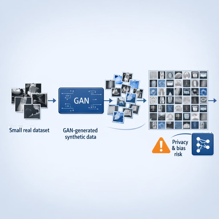 When real data is scarce—like medical scans or rare manufacturing defects—GANs can generate additional examples to help a classifier train more robustly. A helpful diagram is a small dataset becoming a larger, more diverse training set. Add a caution: synthetic data can leak sensitive traits or introduce hidden biases, so evaluation and privacy safeguards matter.