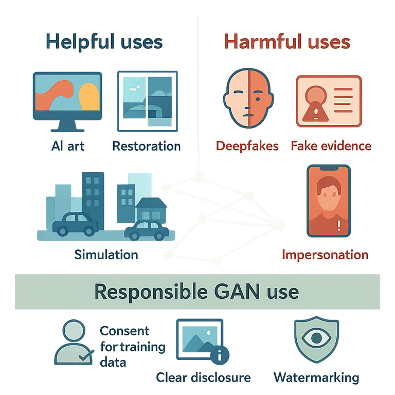 Because GANs can create convincing synthetic media, they raise risks: deepfakes, fraud, misinformation, and privacy violations. An audience-friendly slide can contrast beneficial uses (art, simulation, restoration) with harmful ones (impersonation, fake evidence). Responsible practice includes consent for training data, clear disclosure, watermarking or detection tools, and limiting high-risk deployments.