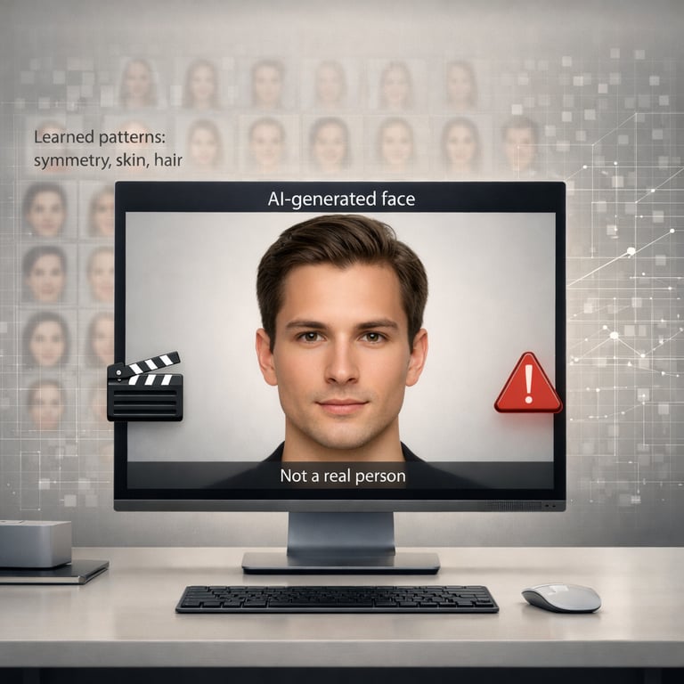 A classic example is generating photorealistic human faces that do not belong to any real person. By learning repeated patterns across many photos—symmetry, skin texture, hair, and background blur—the generator can create convincing portraits. This is powerful for entertainment and design, but also shows why people worry about misuse in impersonation or deceptive media.