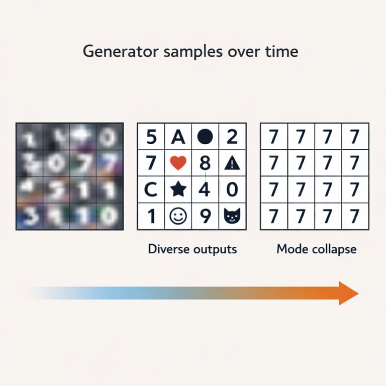 GANs are famous for being tricky to train. Mode collapse happens when the generator finds a narrow trick that fools the discriminator and keeps producing near-identical outputs, hurting diversity. Other issues include unstable oscillations, strange artifacts, or a discriminator that becomes too strong too early. Encourage showing grids of samples over time to monitor variety and quality.