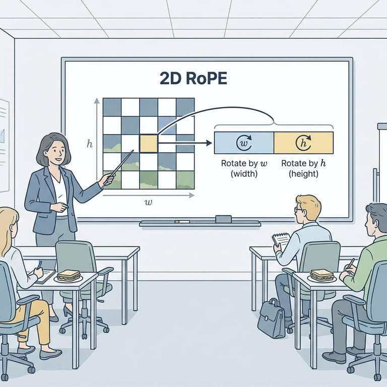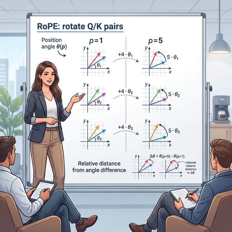 To explain positional encoding, Sarah uses a geometric story: Rotary Positional Encoding splits query and key vectors into 2D pairs and rotates each pair by a position-dependent angle. Different pairs rotate at different rates, letting attention infer relative distance through geometry instead of adding a separate position embedding to every token.