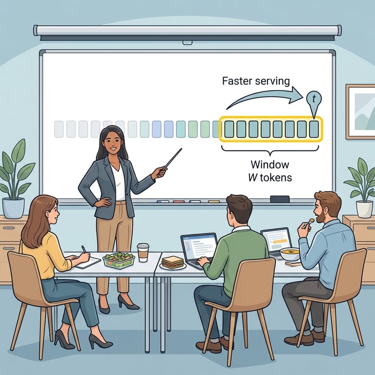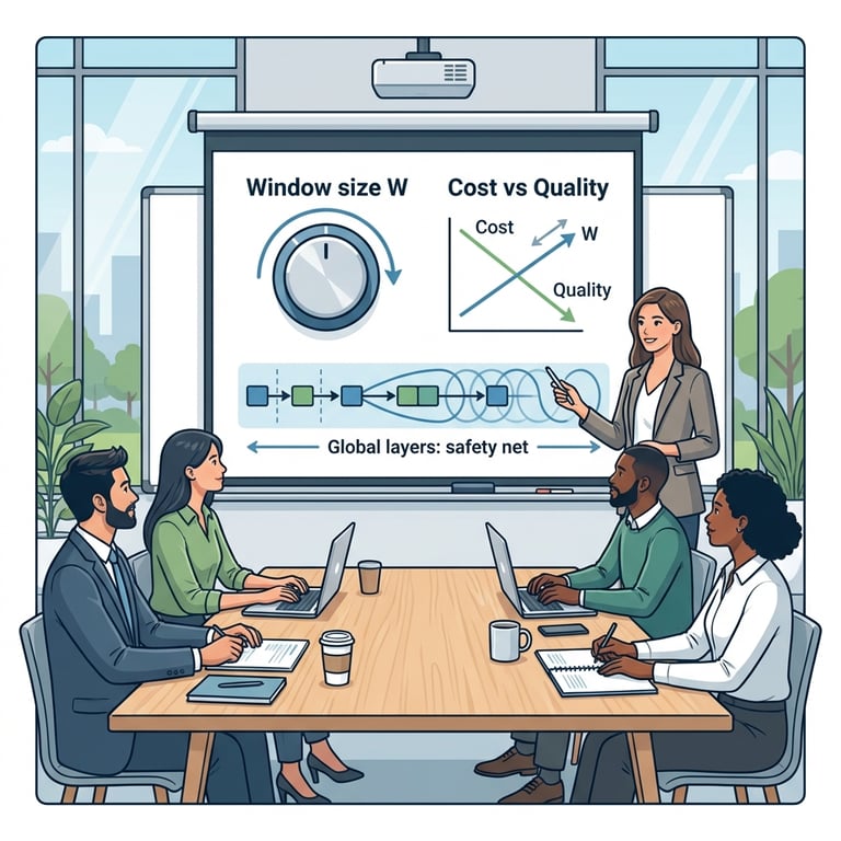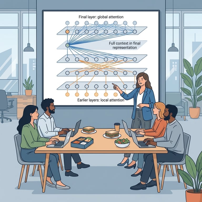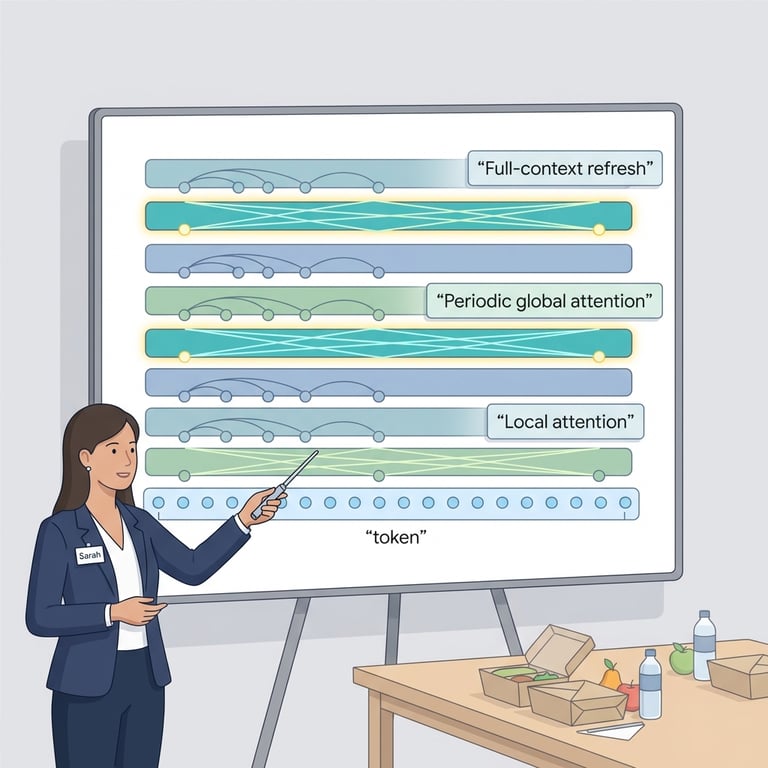 To fix the dilution, she introduces periodic global attention layers that reconnect distant tokens directly. These layers act like full-context refresh points: they can re-anchor the representation to the entire history, restoring coherence in tasks that require earlier constraints, long documents, or reasoning that depends on far-apart facts.