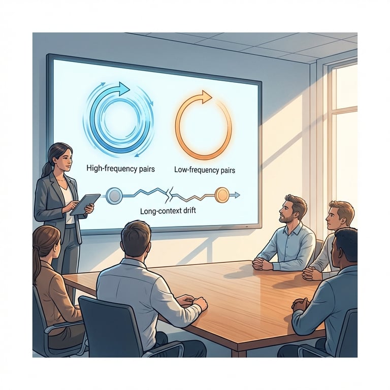 She notes that high-frequency pairs change rapidly with position and help with precise ordering, while low-frequency pairs rotate slowly and better preserve semantics. Over very long contexts, accumulated rotation can misalign far-apart tokens, so she frames long-context stability as a battle against positional noise leaking into meaning-bearing dimensions.