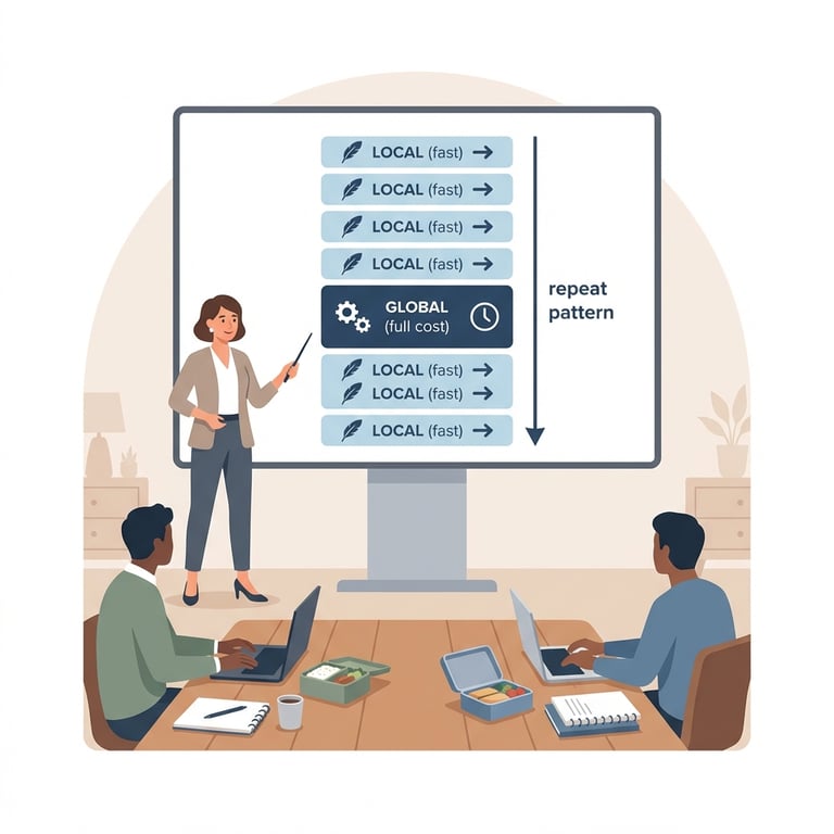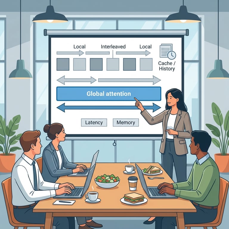 Sarah presents interleaving as a rhythm rather than a hack: most layers stay local for speed, and occasional global layers pay the full price to maintain long-range structure. She notes that different model sizes can use different local-to-global patterns, but the intent remains consistent—efficient most of the time, complete when needed.