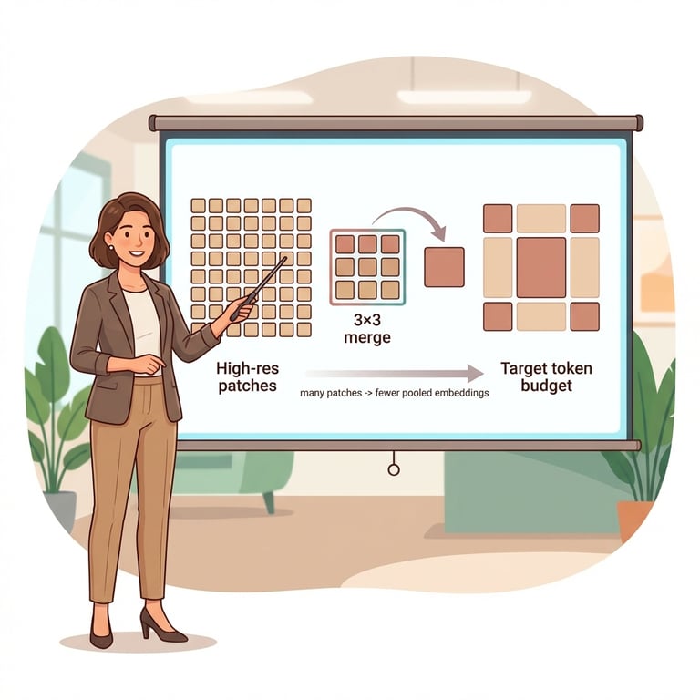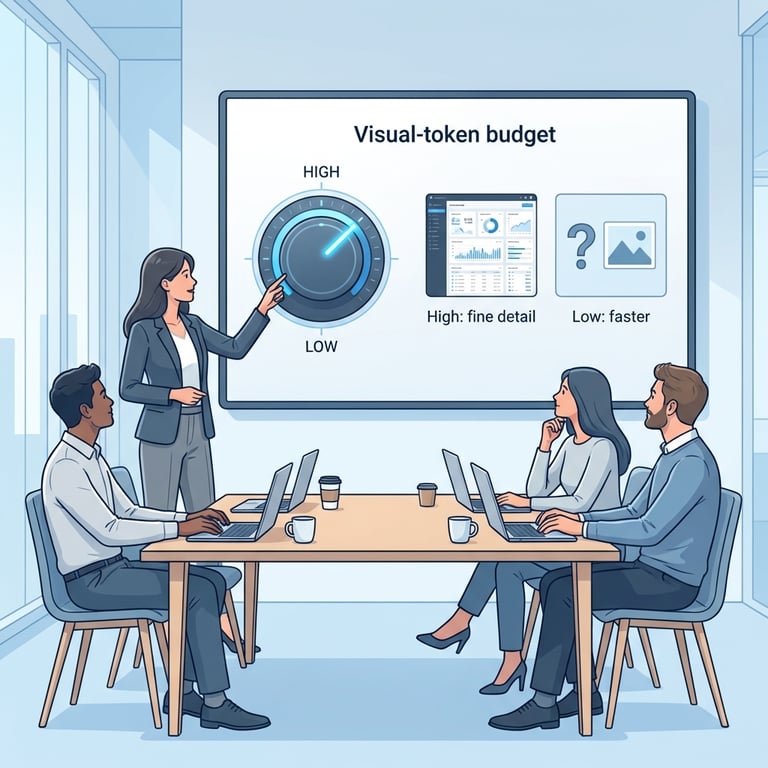 She presents the visual-token budget as a user-facing dial: higher budgets retain fine detail for small text, charts, or dense UI screenshots, while lower budgets speed up inference and reduce context load. Sarah encourages the team to treat this like selecting image resolution for a task—don’t overspend tokens when the question is simple.