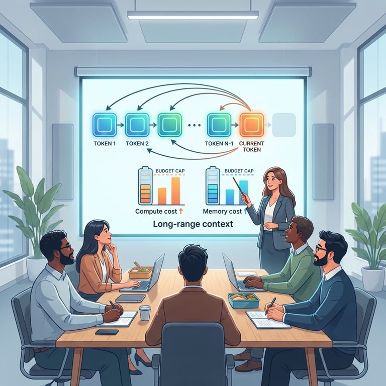 Sarah transitions to attention by highlighting the fundamental cost issue: letting each token attend to all prior tokens captures long-range structure, but it can be expensive in both compute and memory. She frames the rest of the middle section as a set of engineering choices to keep context handling strong without blowing budgets.