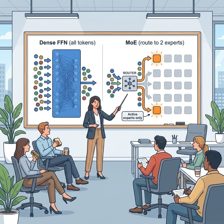 She contrasts that with Mixture-of-Experts: instead of one big feedforward block, there are many smaller expert blocks, and tokens are routed to only a subset. The team grasps her core message: MoE can store lots of knowledge in total parameters, while keeping per-token compute closer to a smaller active footprint.