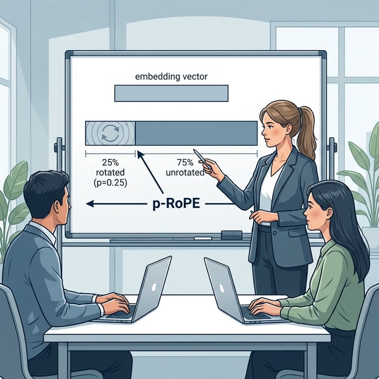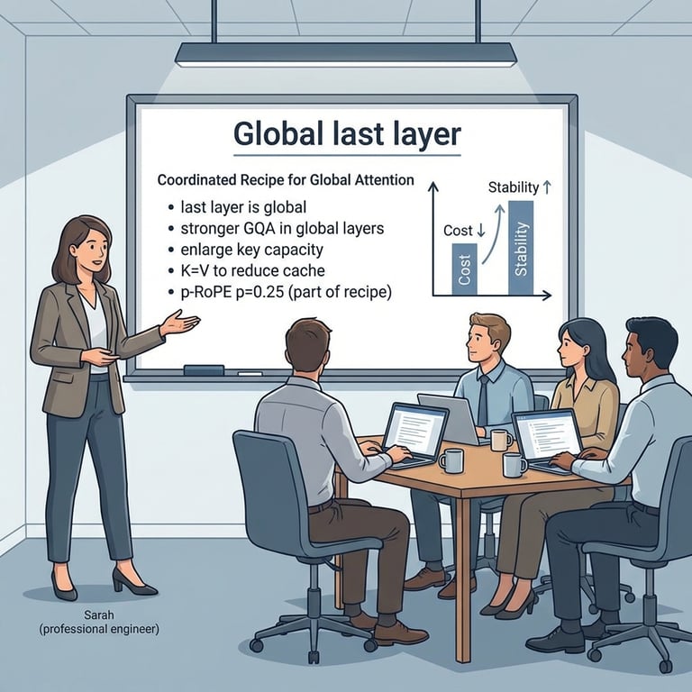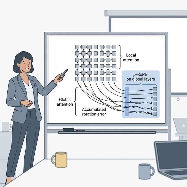 She connects the dots: global attention spans the widest range of relative distances, so it suffers most from accumulated rotation effects. Applying p-RoPE specifically to global layers keeps long-range comparisons steadier by reserving more stable subspace for meaning. Sarah frames it as “save precision where distance is enormous.”