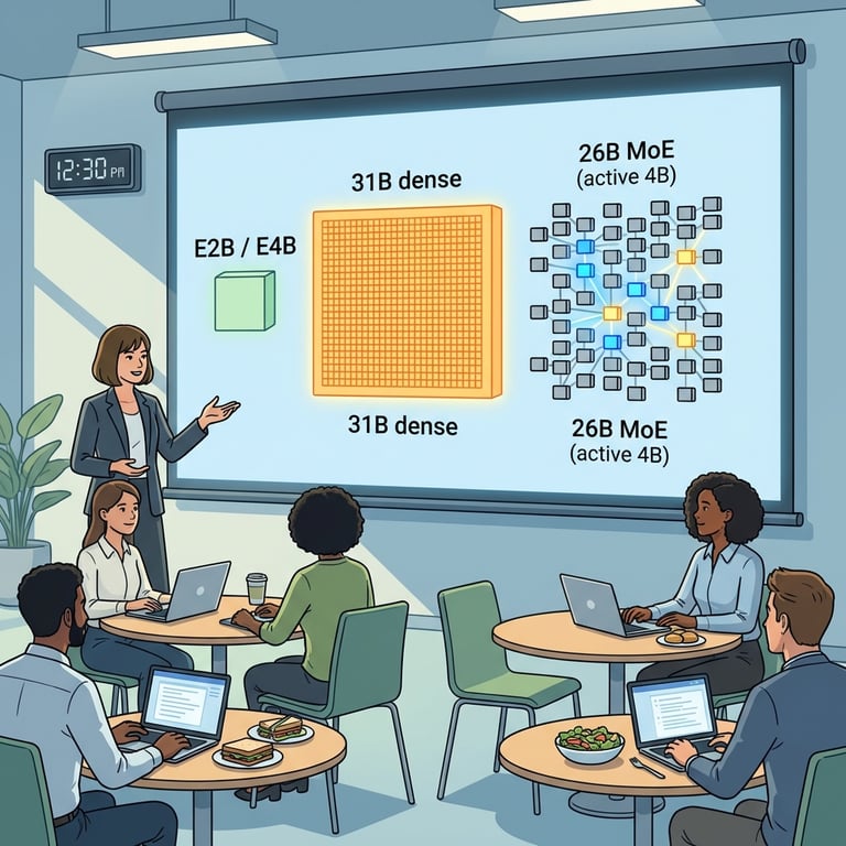 She introduces the lineup in one sweep: compact E2B and E4B options, a large 31B dense model, and a 26B A4B Mixture-of-Experts option that activates a smaller slice of compute at inference. Sarah’s narrative sets up the theme that “size” can mean parameters, active compute, or both, depending on design.