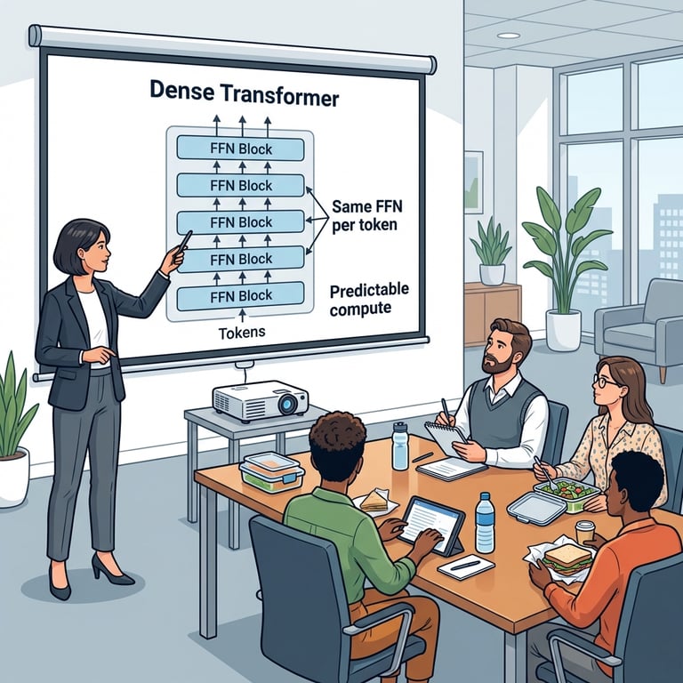 To ground everyone, Sarah explains dense Transformers as the steady baseline: every token goes through the same feedforward capacity in every layer, so compute per token is predictable. That simplicity can help with debugging and performance consistency, which is why dense models often become the reference point for comparisons.