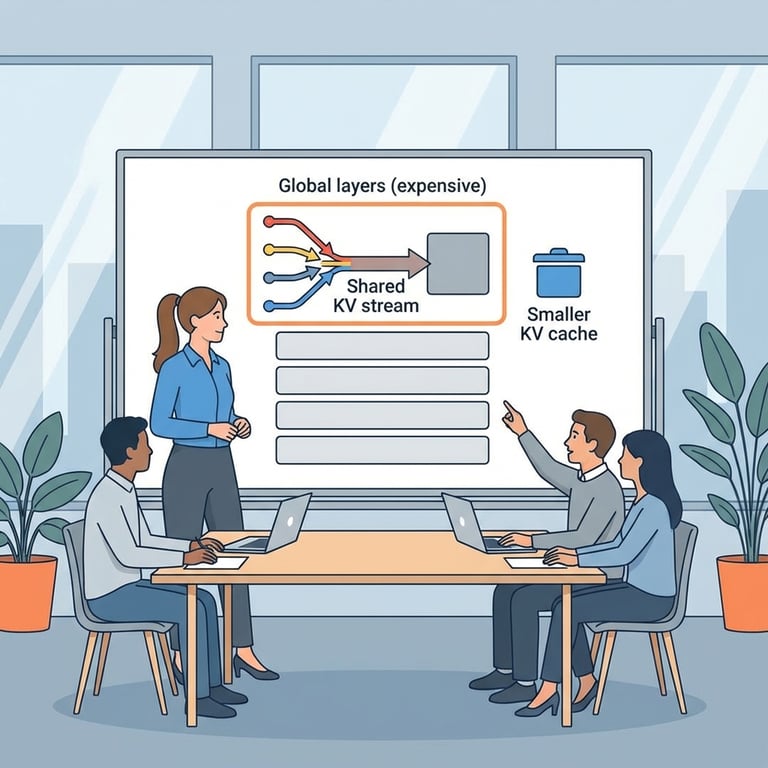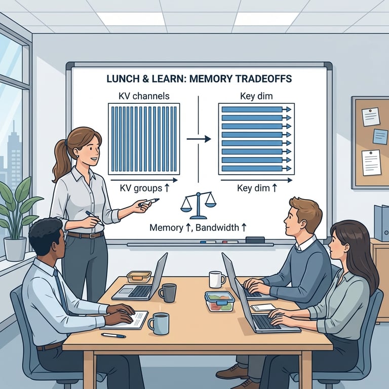 Because heavier grouping reduces distinct KV channels, Sarah describes a compensating move: increase the dimensionality of keys in global attention so each key can carry more information. The team understands the balancing act—some memory creeps back in, but representational bandwidth improves, keeping global layers useful rather than merely cheap.