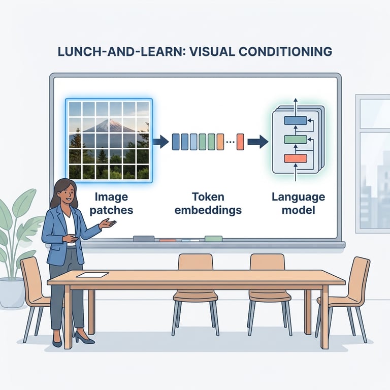 She shifts to multimodality by introducing GemmaVis: a vision encoder that splits an image into fixed-size patches and maps each patch to an embedding, like turning pixels into a token sequence. Sarah stresses the conceptual bridge—once the image is tokenized, the language model can condition on it using familiar sequence machinery.