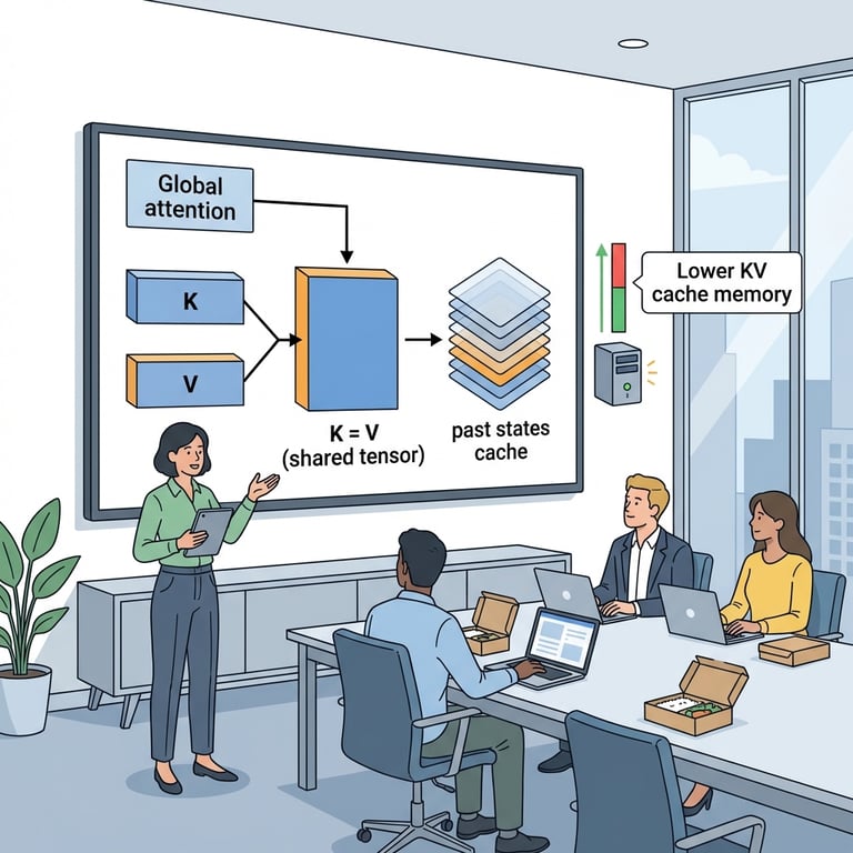 She then shares a simpler cache-saving trick: set keys equal to values in global attention so only one tensor needs to be stored for past states. Sarah presents it as an engineering compromise that trims memory pressure right where contexts are longest, helping global layers stay deployable under realistic serving constraints.
