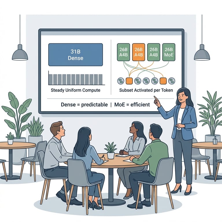 Sarah closes by comparing the 31B dense option to the 26B A4B MoE: dense offers steadier, simpler behavior with consistent compute, while MoE can deliver efficiency by activating a smaller expert subset per token. She summarizes the decision rule she wants remembered—choose dense for simplicity and predictability, MoE for scalable efficiency.