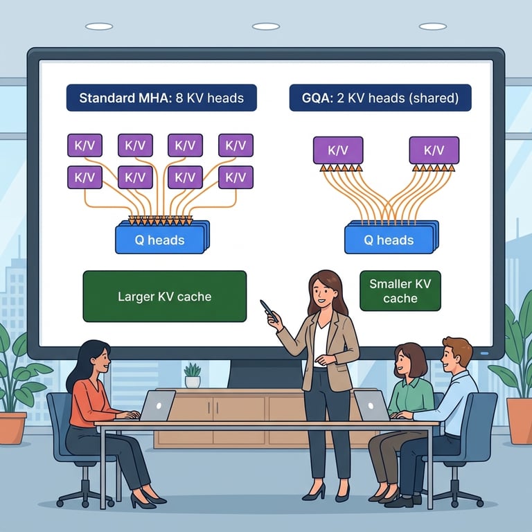 Sarah introduces Grouped Query Attention by describing the cache pain point: storing separate keys and values per head can be heavy. With GQA, multiple query heads share fewer key/value heads, shrinking the KV cache. She stresses that it’s a controlled sacrifice—some head diversity is traded for a large memory win.