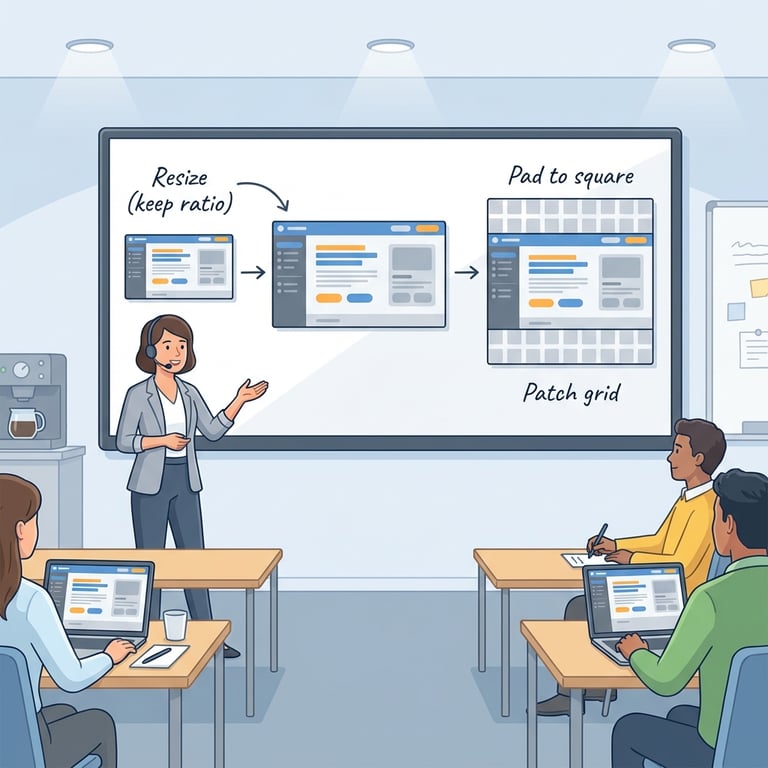 Sarah explains how variable aspect ratios are supported: resize the image while preserving its original proportions, then pad the remaining space so the patch grid stays consistent. This avoids the subtle failures caused by forcing everything into a square, which can stretch text in screenshots or skew shapes that matter in diagrams.