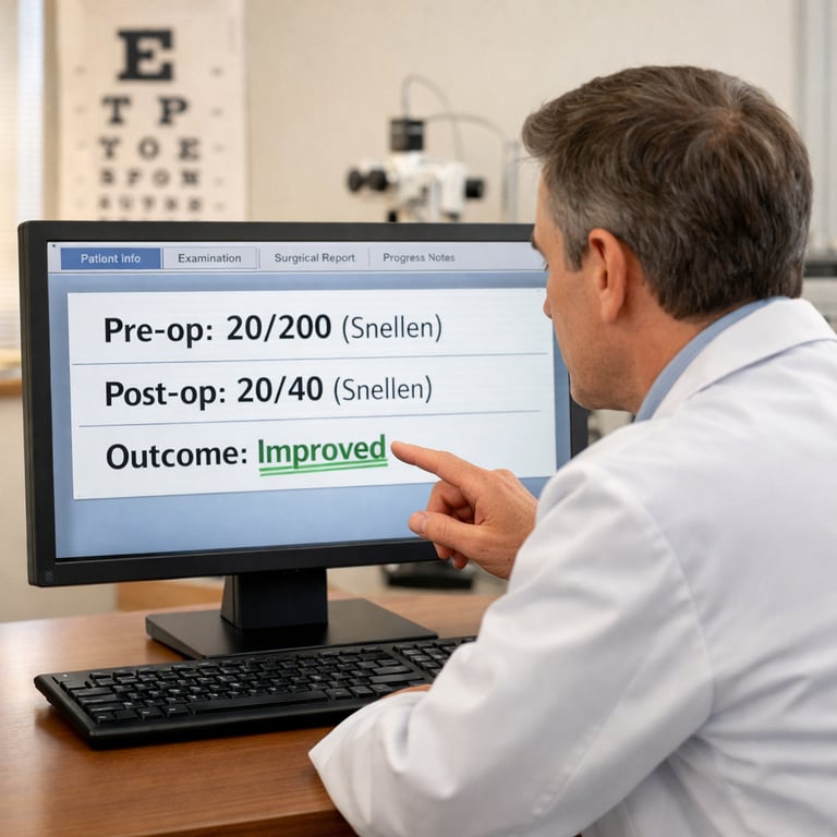 Record patient identifiers, pre- and post-operative vision, and track surgical outcomes to evaluate success.