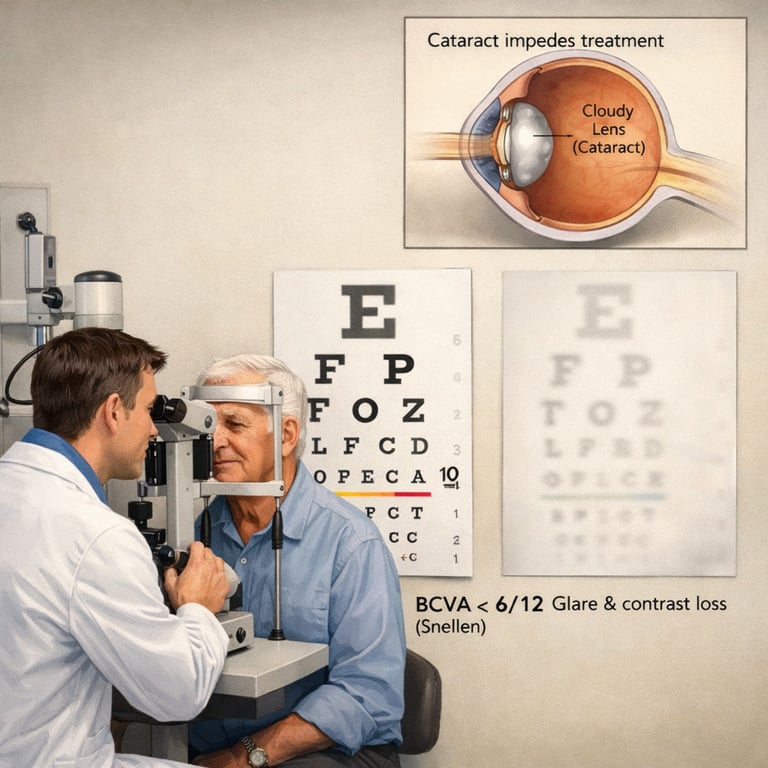 Surgery indicated if BCVA < 6/12 with visual handicaps, glare, or contrast loss, or if cataract impedes treatment.