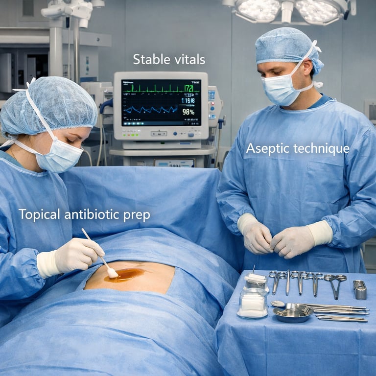 Prepare with topical antibiotics, confirm general health stability, and follow aseptic procedures in surgery.