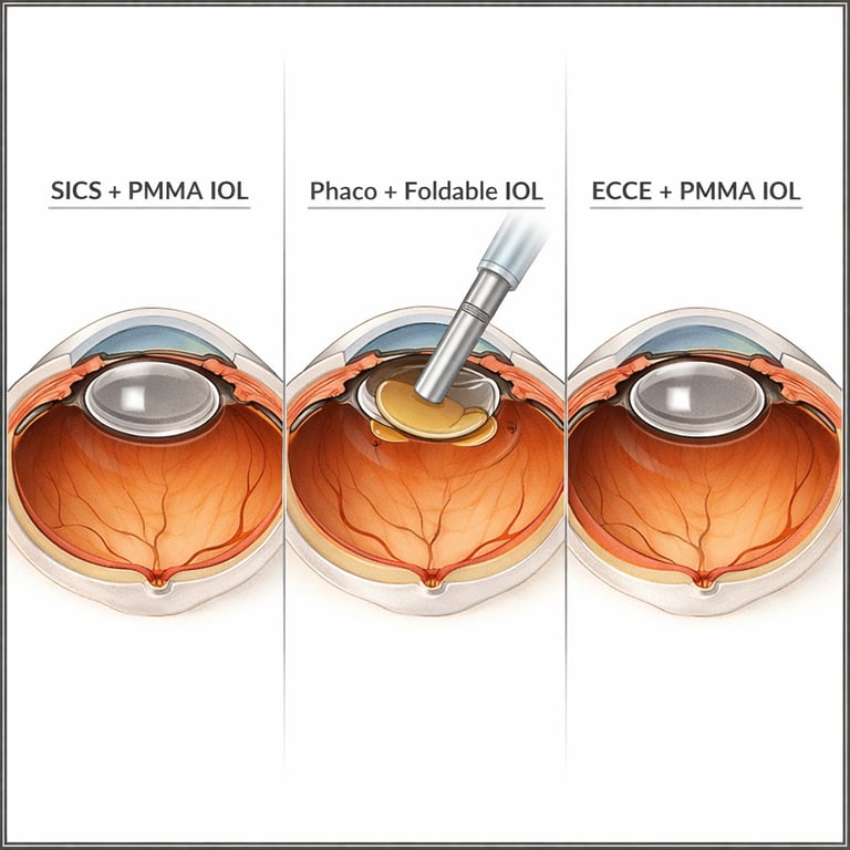 Options include SICS with PMMA IOL, phacoemulsification with foldable IOL, or ECCE with PMMA IOL.