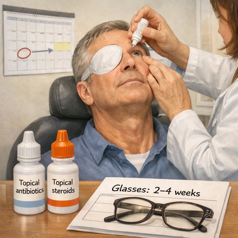 Use topical antibiotics, steroids, follow-up visits, and provide glasses prescription 2-4 weeks after surgery.