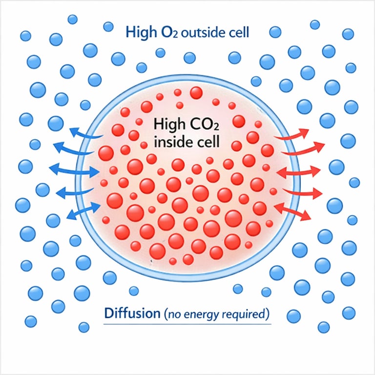 Diffusion is the spontaneous movement of substances from higher to lower concentration and is crucial for gas exchange in cells. For example, CO2 produced as waste can diffuse out when its concentration is higher inside the cell than outside, while O2 can diffuse in when internal O2 levels drop. This simple mechanism enables essential respiration-related exchange without energy expenditure.