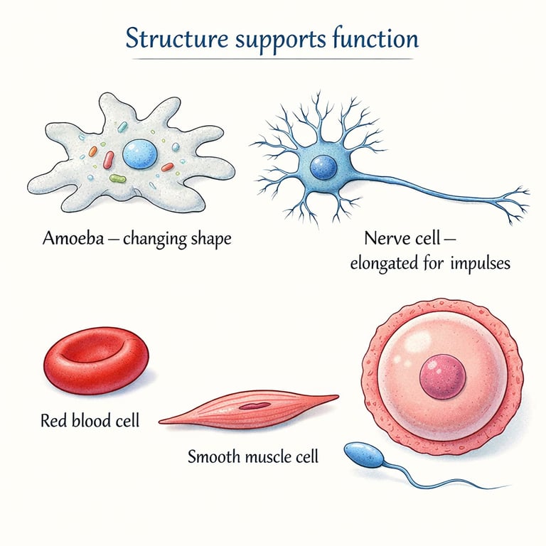 Cells differ widely in size and shape depending on what they do: Amoeba can change shape, while nerve cells have a characteristic elongated form suited for conducting impulses. Even within one organism, different tissues contain specialized cells (e.g., blood cells, bone cells, smooth muscle cells, sperm, ovum), illustrating how structure supports function across cell types.