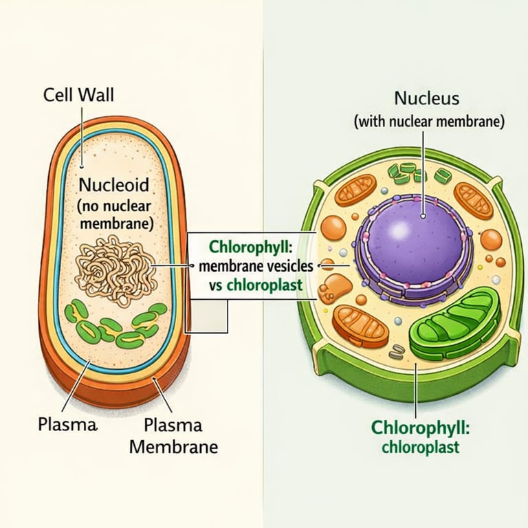 In bacteria, the nuclear region is not enclosed by a nuclear membrane, forming an ill-defined nucleoid; such organisms are prokaryotes. Eukaryotes have a well-defined nucleus with a nuclear membrane and possess membrane-bound organelles. Prokaryotes generally lack these organelles, and even photosynthetic prokaryotes associate chlorophyll with membranous vesicles rather than plastids, highlighting fundamental organizational differences between cell types.