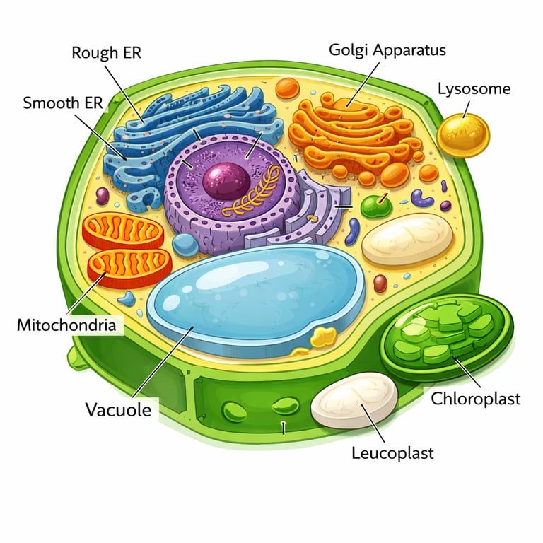 15. Major organelles and their key functions (ER, Golgi, lysosomes, mitochondria, plastids, vacuoles)