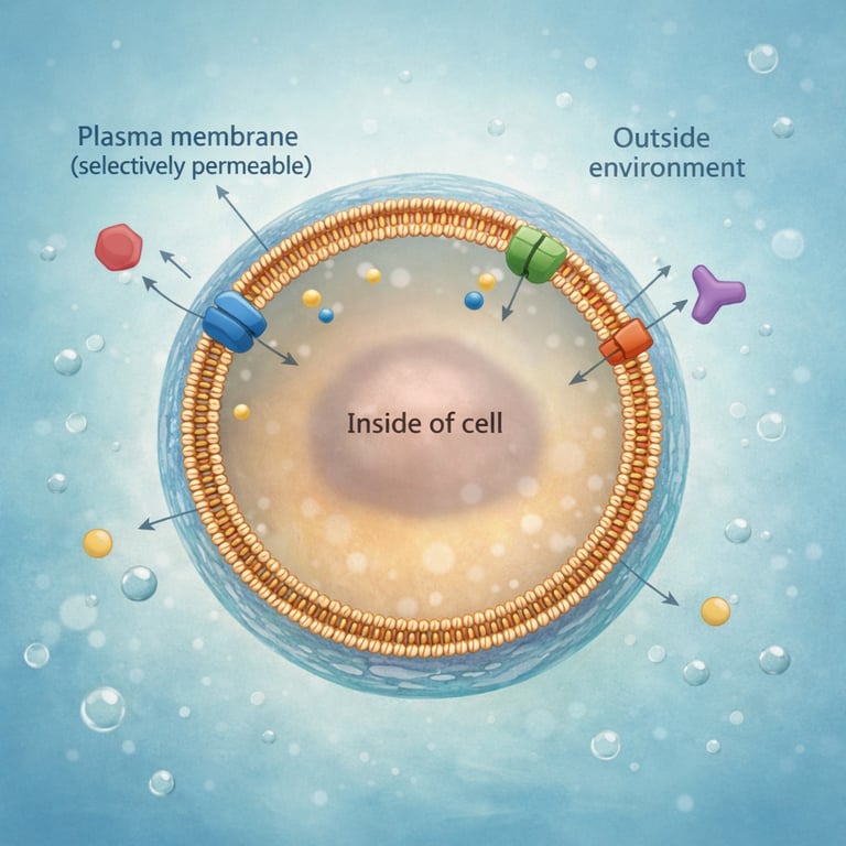 The plasma membrane is the outer boundary separating a cell from its environment, regulating what enters and exits. Because it permits some substances to pass while restricting others, it is called selectively permeable. Its flexibility and composition (lipids and proteins) support controlled exchange and interactions with surroundings, forming the basis for homeostasis at the cellular level.
