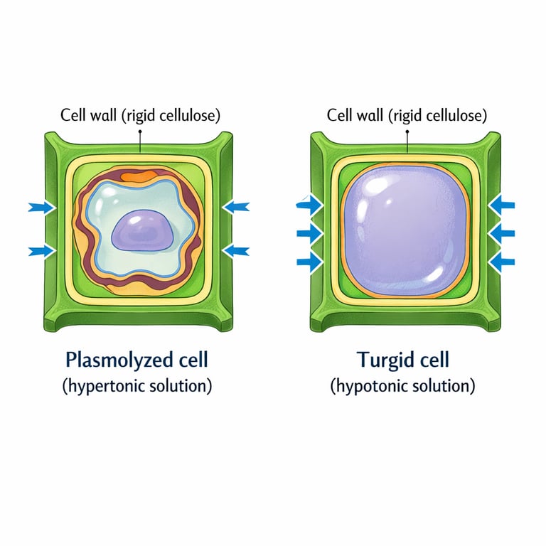 Plant cells have a rigid cell wall outside the plasma membrane, mainly made of cellulose, providing mechanical strength. In hypertonic conditions, living plant cells may show plasmolysis—cell contents shrink away from the wall due to water loss. Cell walls help plant, fungal, and bacterial cells withstand hypotonic environments by resisting bursting as incoming water builds pressure (turgor) against the wall.