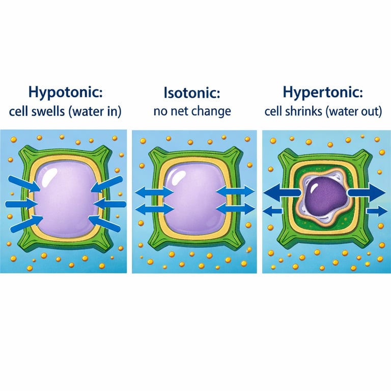 Osmosis is the net diffusion of water across a selectively permeable membrane toward higher solute concentration. In hypotonic solutions (more water outside), cells gain water and swell; in isotonic solutions, there is no net change; in hypertonic solutions (less water outside), cells lose water and shrink. These outcomes explain why cell size and turgor depend strongly on external solute conditions.