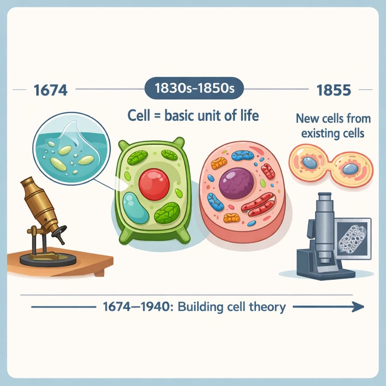 Cell theory states that plants and animals are composed of cells and that the cell is the basic unit of life, proposed by Schleiden (1838) and Schwann (1839), and expanded by Virchow (1855) who argued cells arise from existing cells. Other milestones include Leeuwenhoek’s first observation of free-living cells (1674), Brown’s discovery of nucleus (1831), Purkinje’s “protoplasm” (1839), and electron microscope use (1940) revealing organelles.