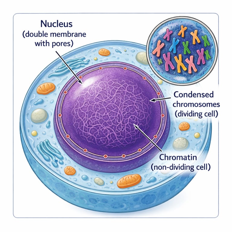 The nucleus, bounded by a double-layered nuclear membrane with pores, directs cell activities and reproduction. It contains chromosomes—DNA and protein structures visible during division—carrying hereditary information. In non-dividing cells, DNA exists as chromatin (thread-like network) that condenses into chromosomes before division; functional DNA segments are genes, which encode information needed to construct and organize cells.