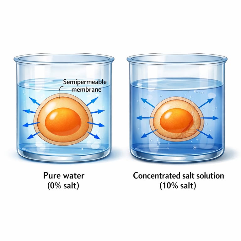 Removing an egg shell with dilute HCl leaves a semipermeable membrane; in pure water the egg swells as water enters by osmosis, while in concentrated salt solution it shrinks as water exits to the more concentrated medium. Similarly, dried raisins/apricots swell in water and shrink in concentrated sugar/salt, providing visible, everyday demonstrations of osmotic water movement across biological barriers.