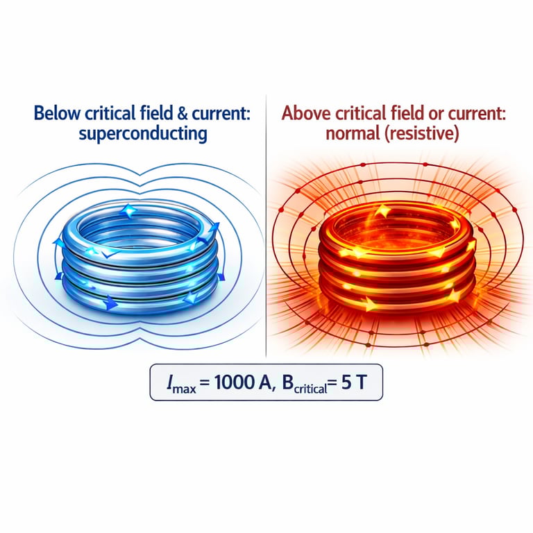 Superconductivity has limits: if the applied magnetic field exceeds a critical value, superconductivity breaks down and the material becomes normal. Similarly, if the current is too large, it can generate fields/heat that destroy the superconducting state. These “critical” values explain why real devices specify maximum field and current ratings for safe operation.