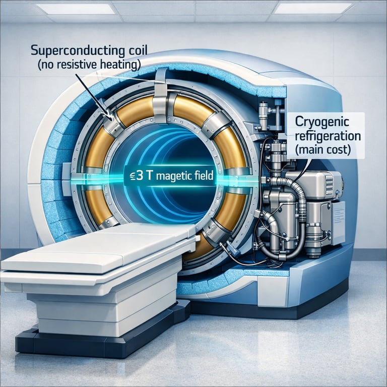Because superconducting coils can carry huge currents without resistive heating, they can generate very strong, steady magnetic fields efficiently. This enables MRI scanners in medicine, particle accelerator magnets, and fusion research devices. The main operating cost is refrigeration, not electrical power lost to heating, making superconductors valuable where strong magnets are essential.