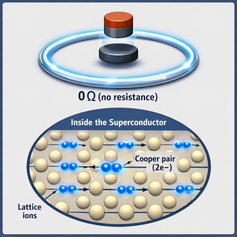 In normal metals, electrons scatter off vibrating atoms and defects, causing resistance and heating. In a superconductor, the DC electrical resistance drops to exactly zero, so a current can persist without a power source in a closed loop. This is why superconducting magnets can run steadily once “charged,” with minimal energy input to maintain low temperature.
