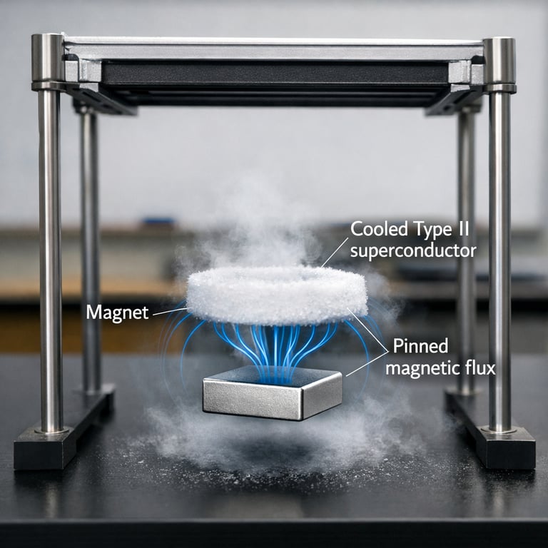 A magnet levitating over a cooled superconductor is a widely used classroom demo. The Meissner effect pushes magnetic fields out, while in many Type II materials, vortex pinning “locks” the magnet’s position, allowing stable levitation even upside down on a track. This gives an intuitive picture of field expulsion and the special magnetic response of superconductors.