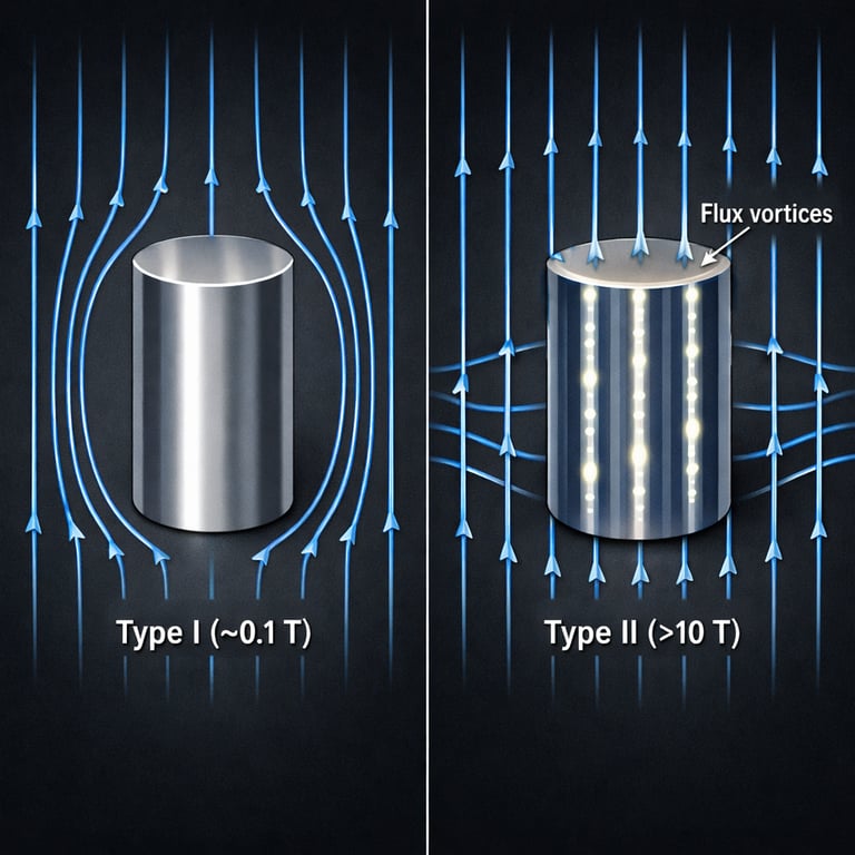 Type I superconductors expel magnetic fields strongly but usually fail at relatively low fields, making them less practical for strong magnets. Type II superconductors allow magnetic flux to enter in quantized vortices between two critical fields, letting them remain superconducting under much stronger fields. Most superconducting technologies (MRI, accelerators) rely on Type II materials.