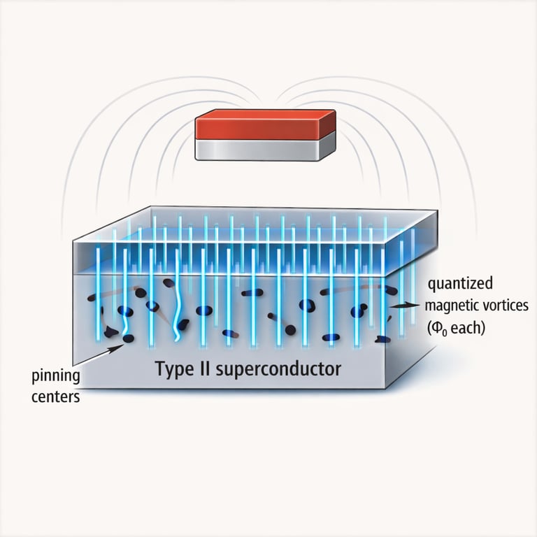 In Type II superconductors, magnetic flux penetrates in tiny “tubes” called vortices, each carrying a fixed amount of flux. This quantization is a hallmark of superconducting quantum behavior and helps explain magnetic levitation stability and magnet performance. Vortex motion can cause losses, so practical superconductors are engineered to “pin” vortices in place.