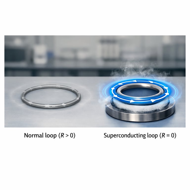 A classic experiment is a superconducting ring: cool it below \(T_c\), induce a current, then remove the power source. The current can persist for extremely long times because there is no resistive dissipation. This demonstration visually contrasts normal loops (current decays) with superconducting loops (current remains), reinforcing the meaning of zero resistance.