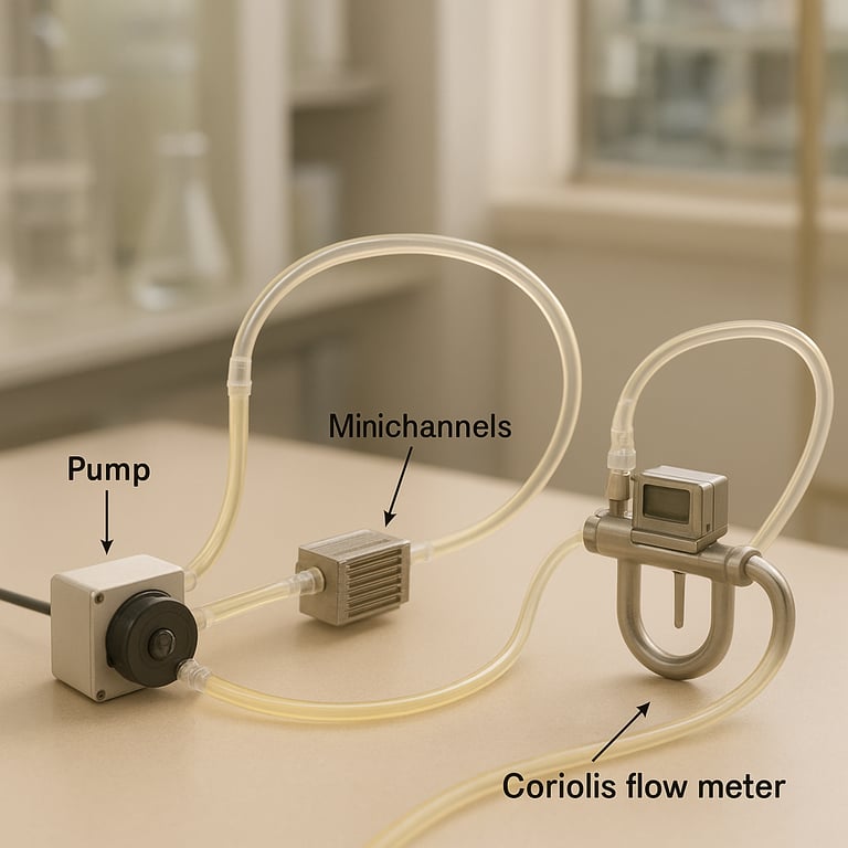 Experiment setup includes a fluidic circuit with minichannels, pump, heat exchangers, and a Coriolis flow meter.